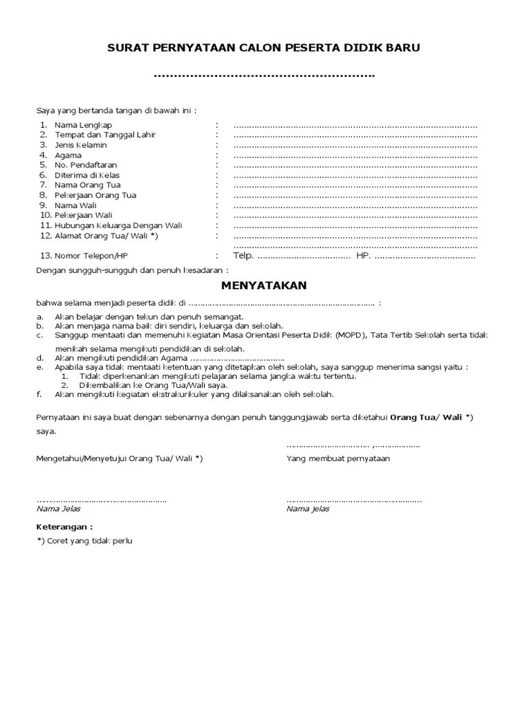 Surat pernyataan calon peserta didik baru yang bertanda tangan di bawah ini: Contoh surat pernyataan orang tua siswa baru. Adalah orang tua/wali dari calon siswa/pendaftar :. Nama orang tua / wali murid : Contoh surat pernyataan peserta didik baru dan orang tua wali untuk ppdb.