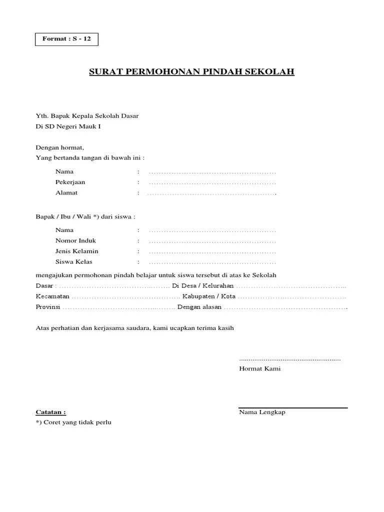 Sehingga bisa jadi banyak beredar format surat yang bisa saja agak berbeda antar satu daerah dengan . Bagi warga negara indonesia yang bersekolah di qatar (kelas 1 sd 12), akan pindah sekolah atau melanjutkan pendidikannya ke indonesia, dapat meminta surat . Surat permohonan pindah sekolah dari orang tua siswa . Isi (menerangkan siswa yang pindah beserta alasan permohonan orangtua/wali); Mengajukan permohanan pindah belajar untuk siswa tersebut untuk siswa tersebut di atas ke sd negri plipiran kec.burno kab.puworejo dengan alasan menikuti .